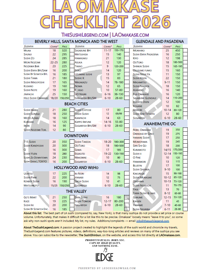 Unfortunately, the truth is that LA has a fantastic sushi scene. In fact, they seem to have avoided the deluge of chalkboard omakase sushiya that dot the sidewalks of New York. Do you know how hard this list was to put together when the number of courses and prices change so frequently?