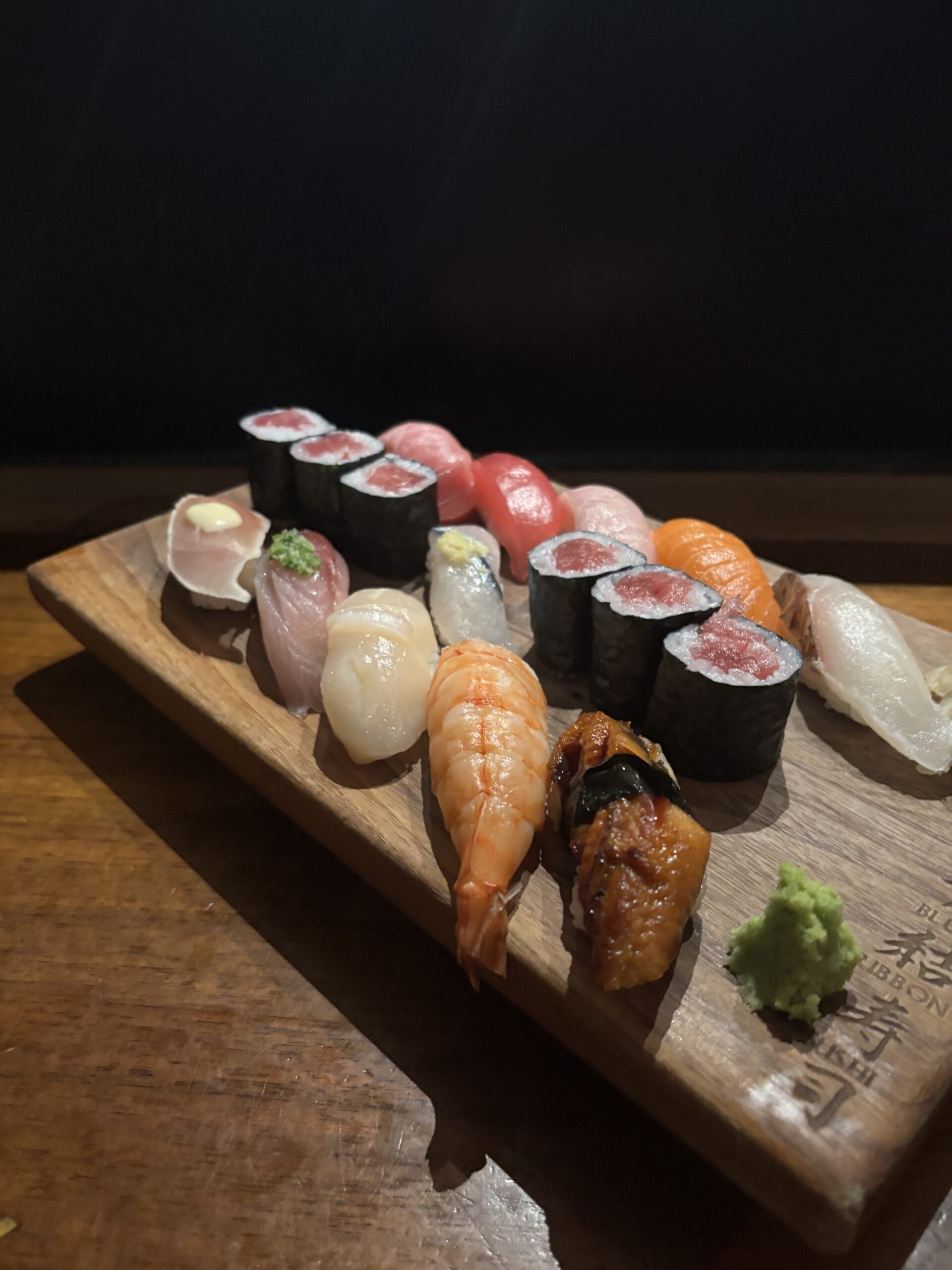 LtR from back: O Toro, Akami, Kinme, Salmon, Madai,Sayori (middle, extra), Albacore, Aji, hotategai, ebi, unagi