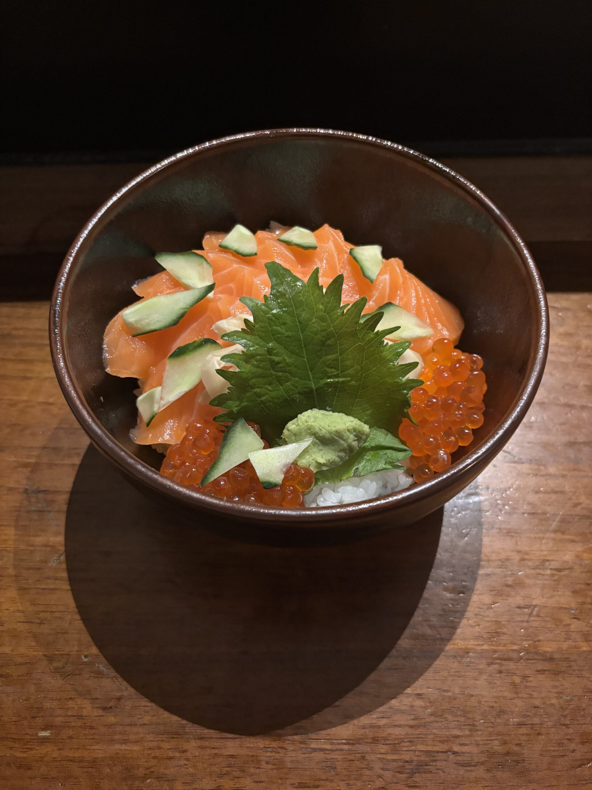 The uneven shari is noticeable by comparison to the rice in the oyakodon, sake (salmon), ikura (salmon roe) layered on rice. Typically, donburi will use plain white rice (chirashi uses vinegared sushi rice – shari). I shit you not, this rice was better. Noticeably. Problem.