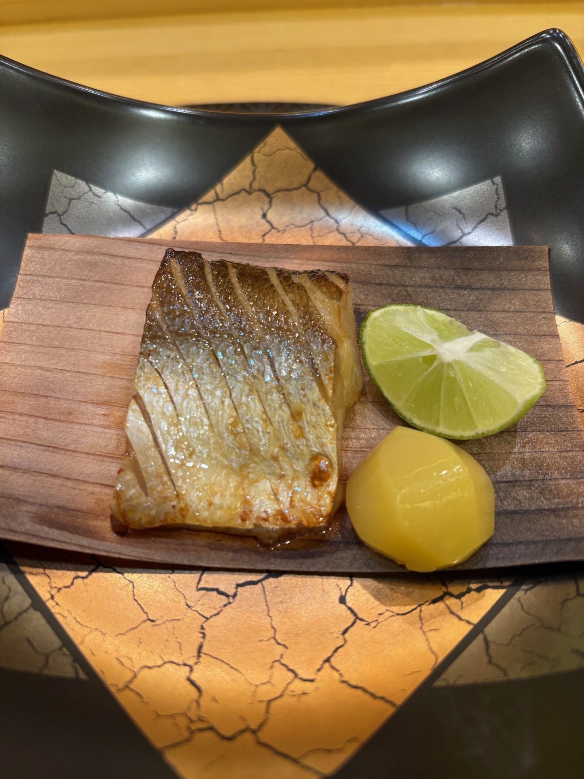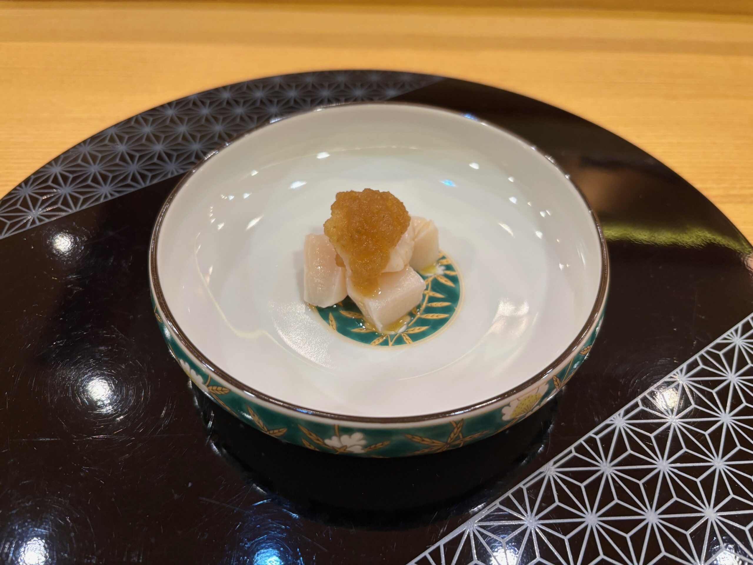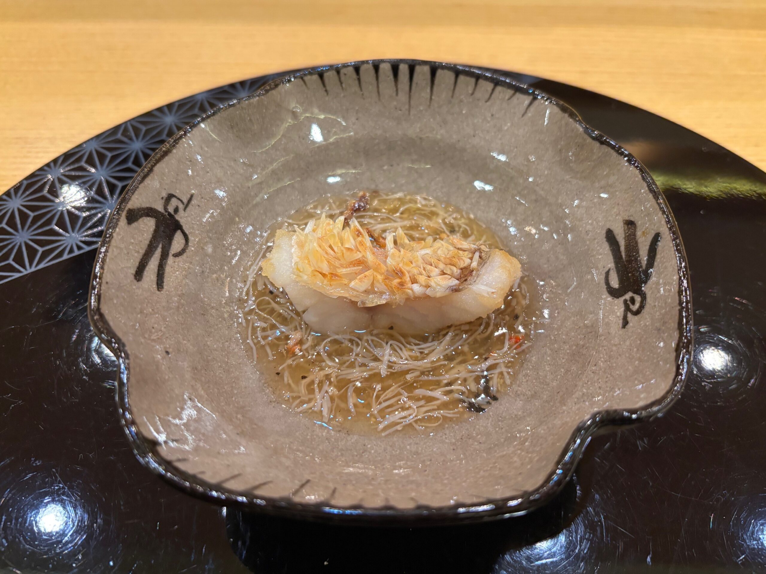 The fifth course was Shiro Amadai (white tilefish); in case you’re curious about the crispy scales, that comes from a technique called matsukasayaki. Hot oil is poured over the skin, which crispens it to resembling a golden pinecone (matsukasa). Hence the name.